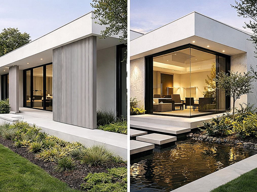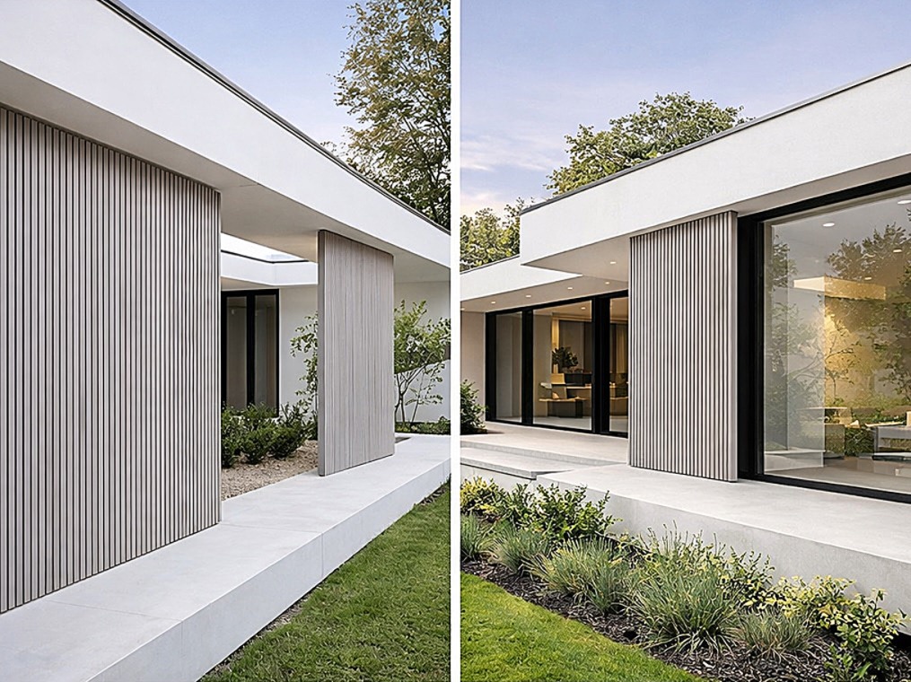 Varianta WHITE — fațadă deschisă, contrast elegant și lumină maximă. Modelul este orientativ și poate fi personalizat în funcție de terenul clientului, buget și cerințele urbanistice.