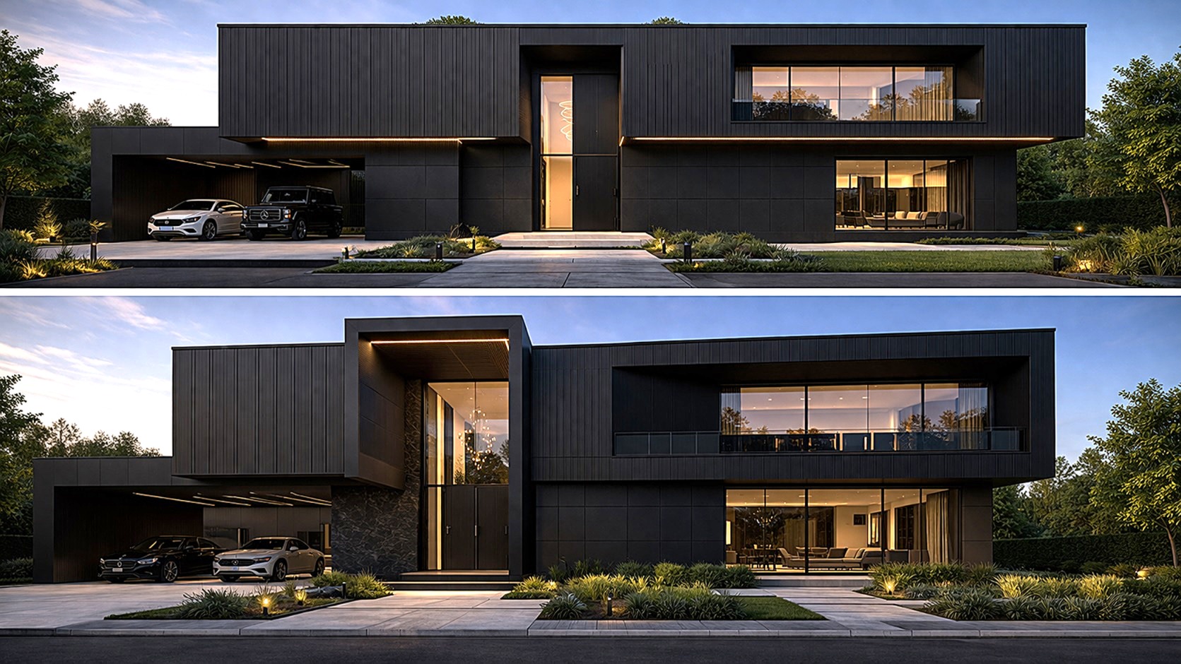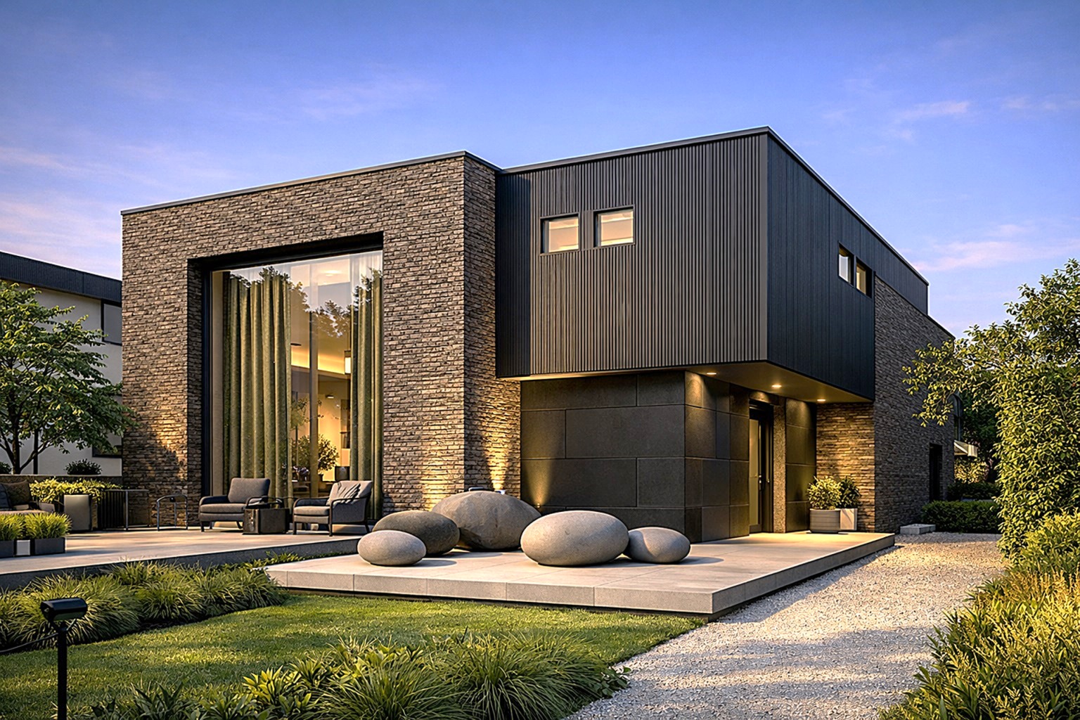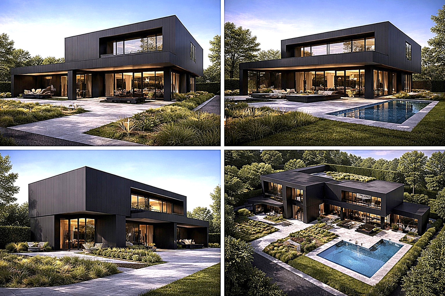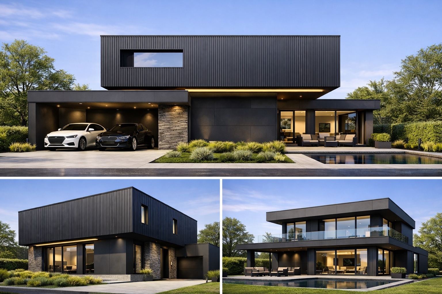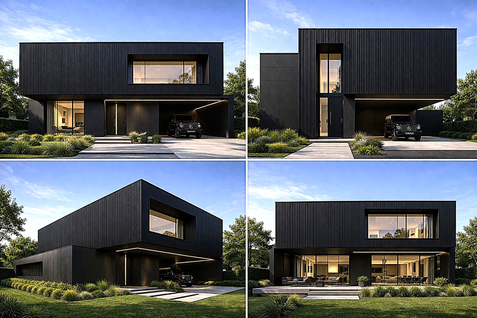 Varianta BLACK MONOLITH — casă contemporană cu arhitectură monolitică, fațadă dark, detalii premium și estetică minimalistă, definită de volume curate, contraste rafinate și prezență puternică. Modelul este orientativ și poate fi personalizat în funcție de terenul clientului, buget și cerințele urbanistice.