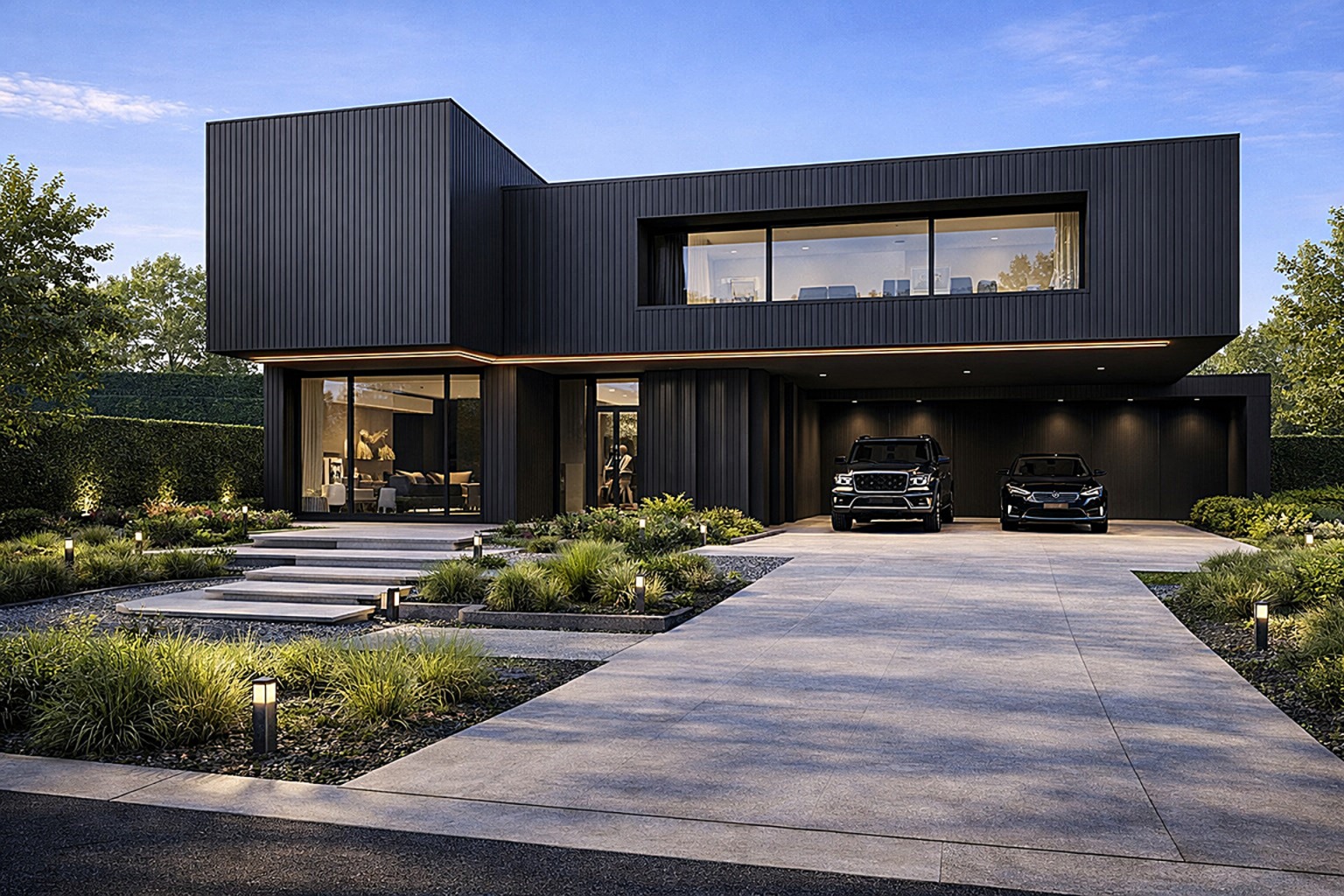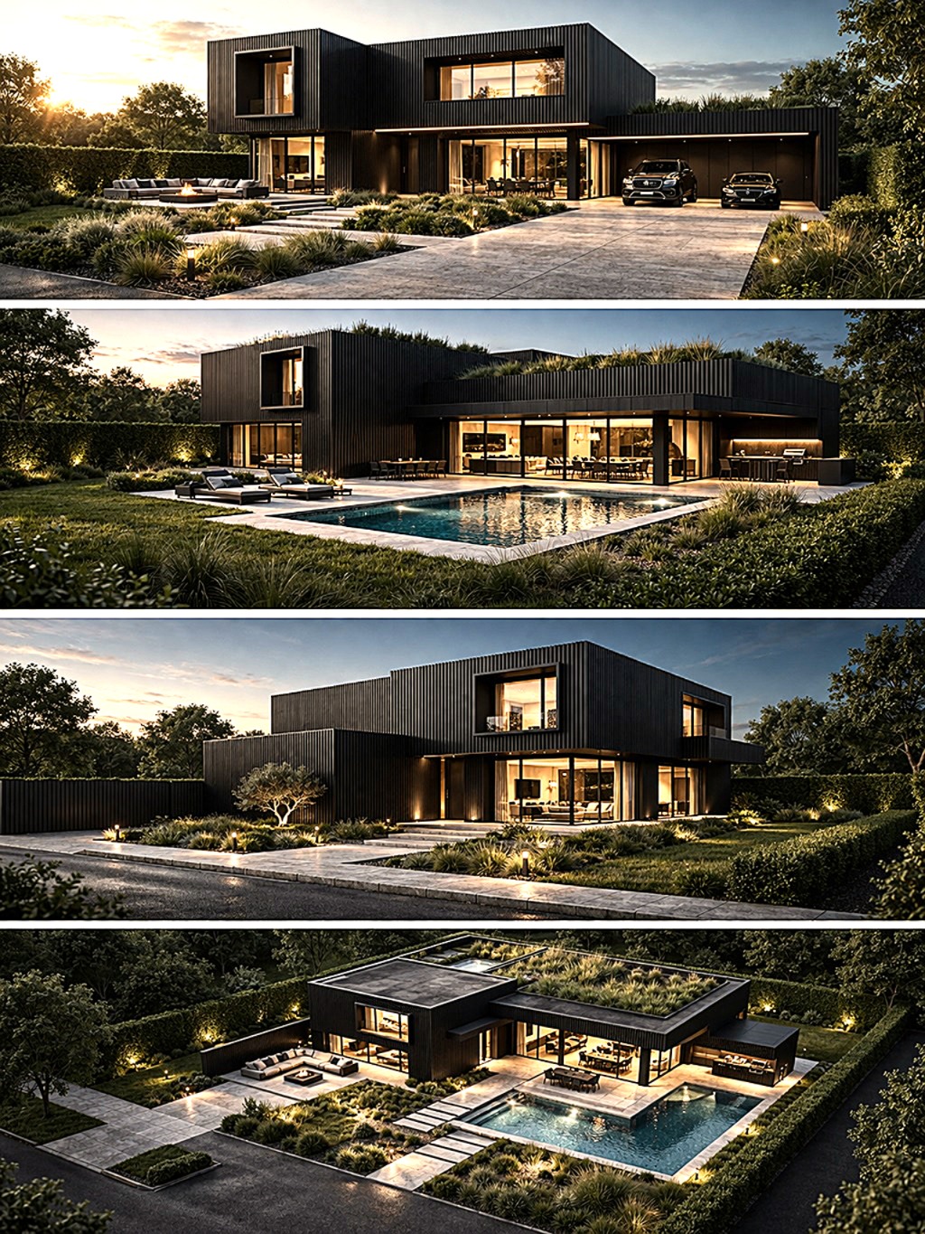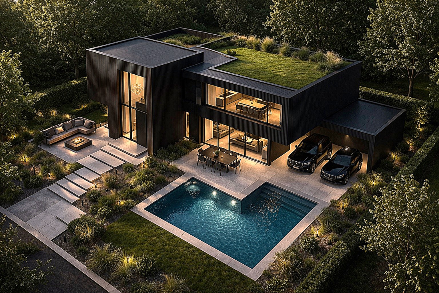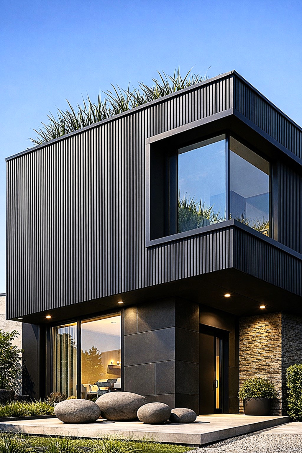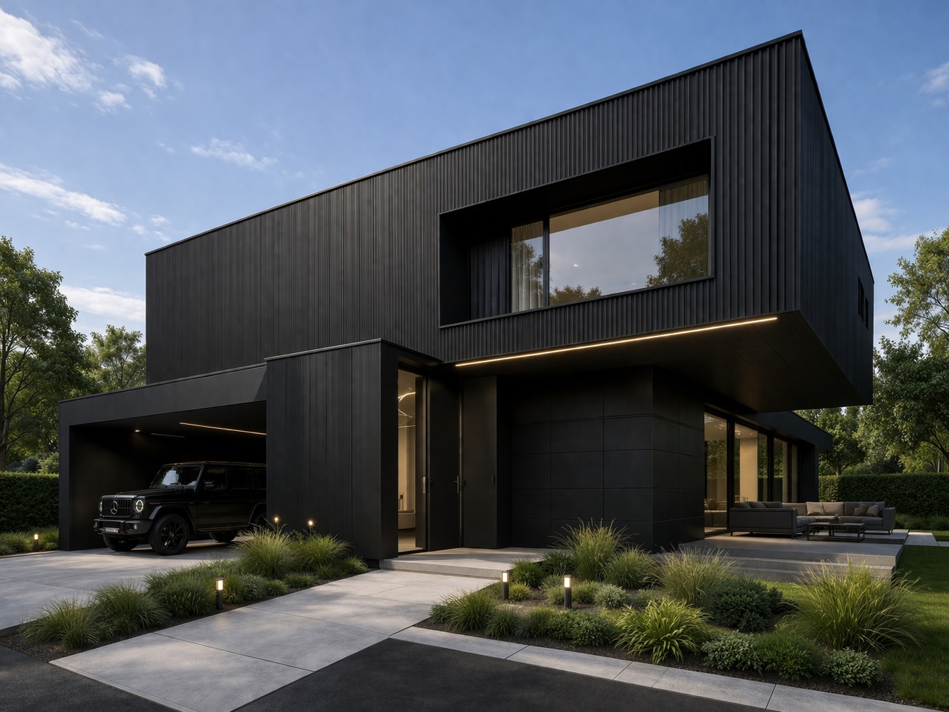 Varianta BLACK MONOLITH — casă contemporană cu arhitectură monolitică, fațadă dark, detalii premium și estetică minimalistă, definită de volume curate, contraste rafinate și prezență puternică. Modelul este orientativ și poate fi personalizat în funcție de terenul clientului, buget și cerințele urbanistice.