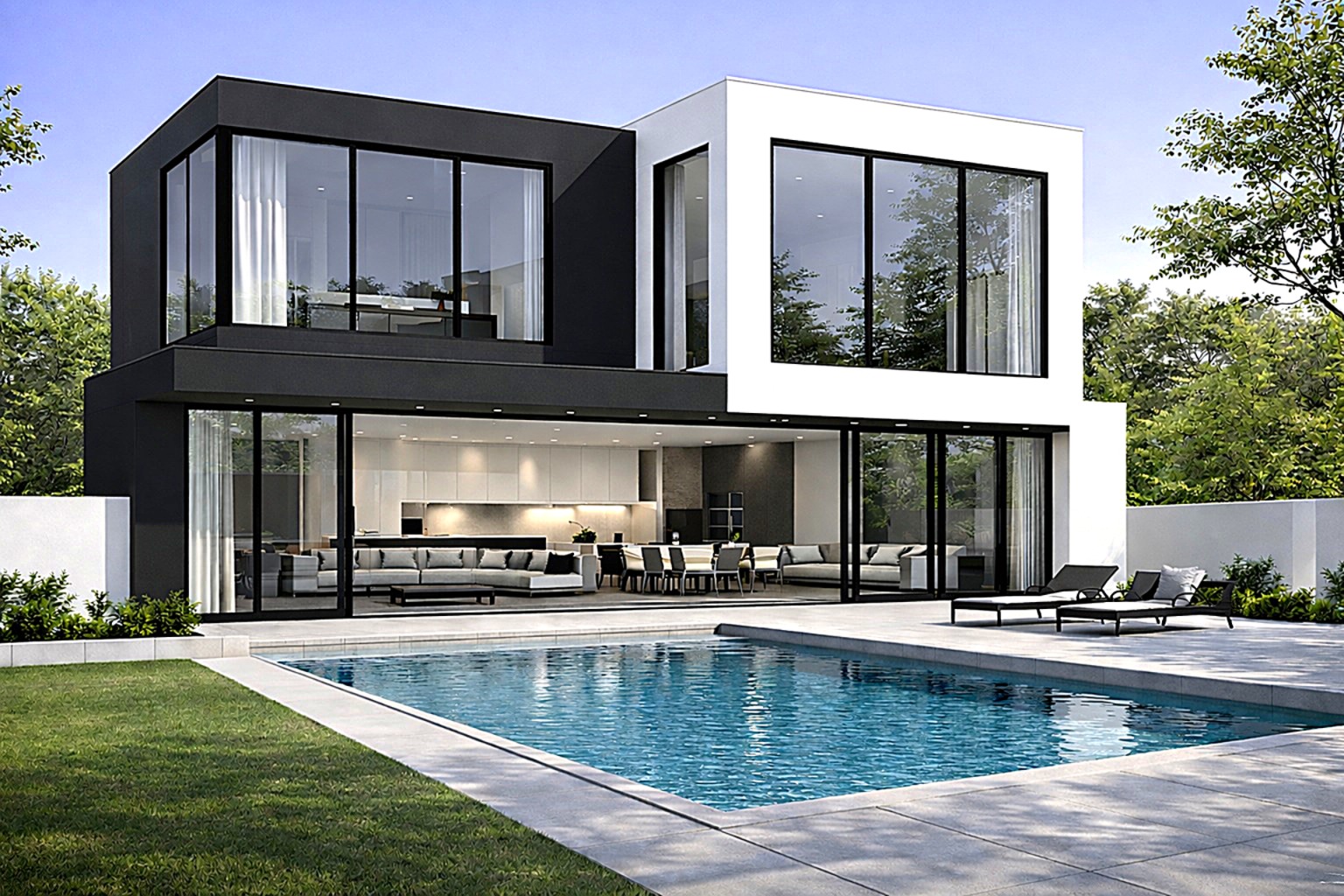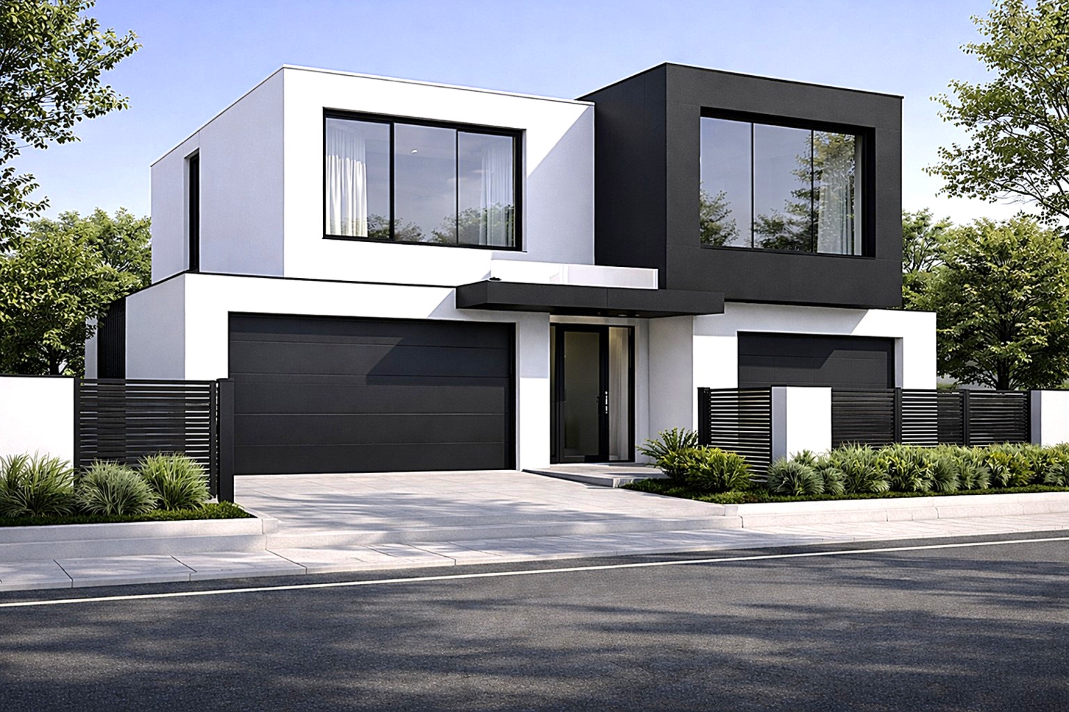 Varianta CUBE FRAME — Casă premium, cu volumetrie curată și expresie contemporană. Modelul este orientativ și poate fi personalizat în funcție de terenul clientului, buget și cerințele urbanistice.