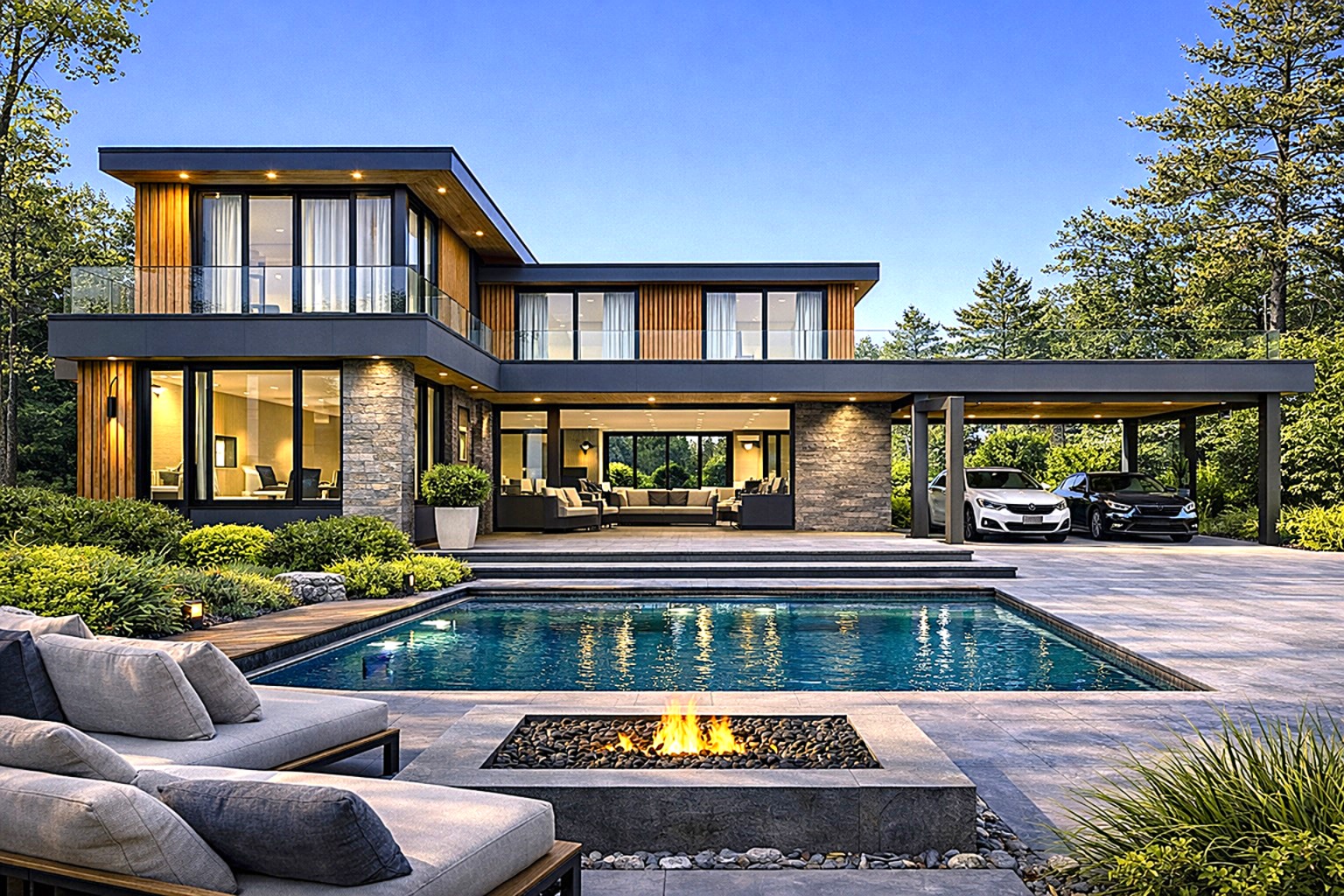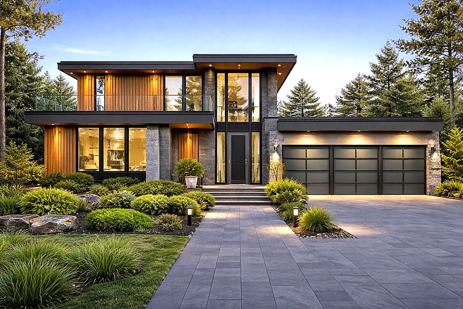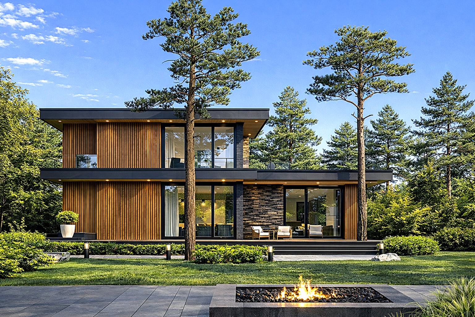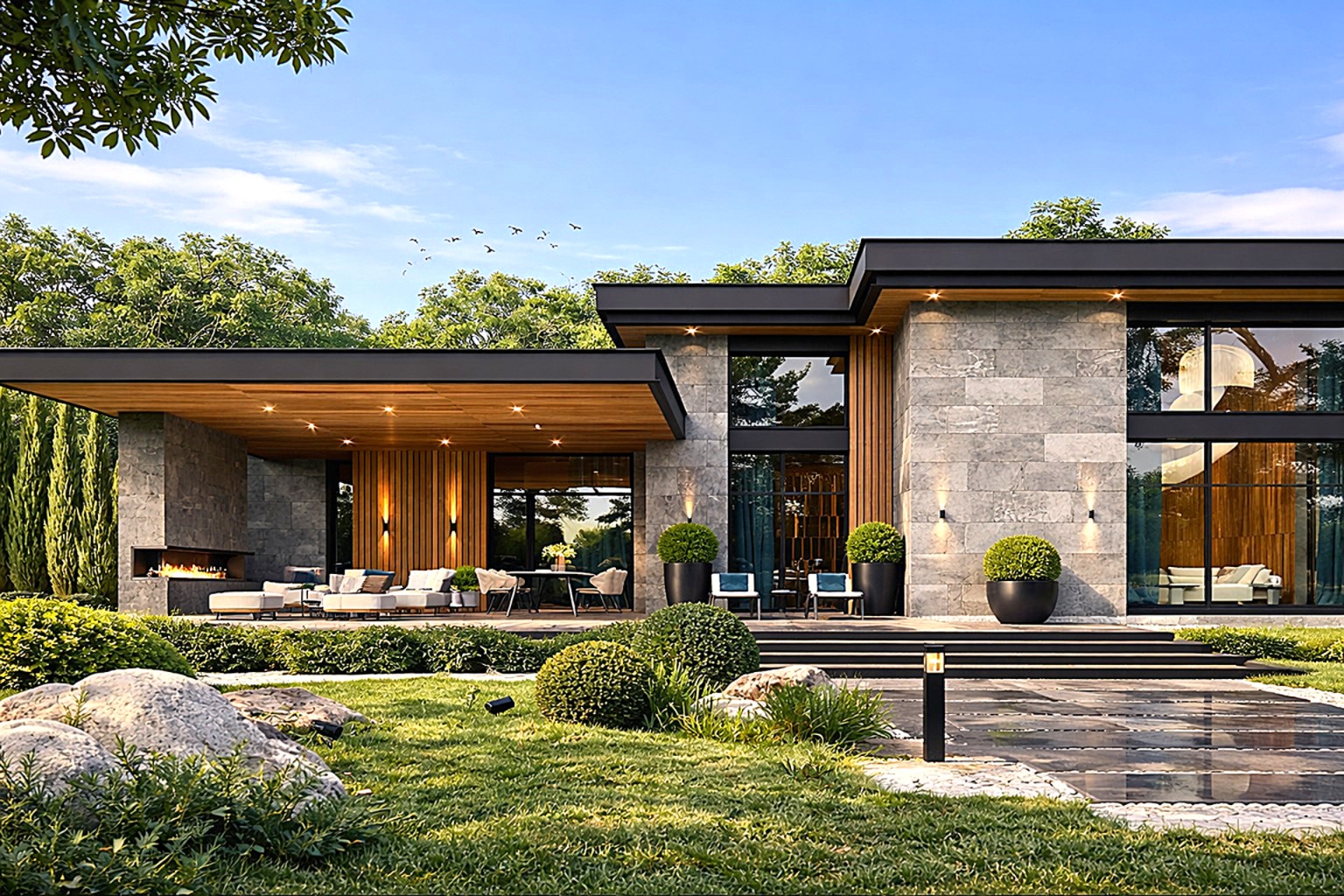 Casă premium cu volumetrie clară, materiale naturale și o imagine arhitecturală calmă, coerentă și actuală. Modelul este orientativ și poate fi personalizat în funcție de terenul clientului, buget și cerințele urbanistice.